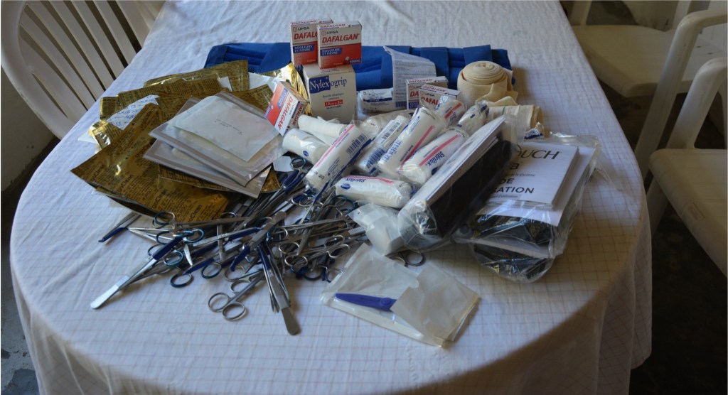 Distribution de médicaments, de 10 tubes de Revamil (crème préparée à base de miel pour l’usage médical et en particulier pour la cicatrisation des plaies) et de petits matériels médical (pinces, ciseaux,…) au Docteur Touva.