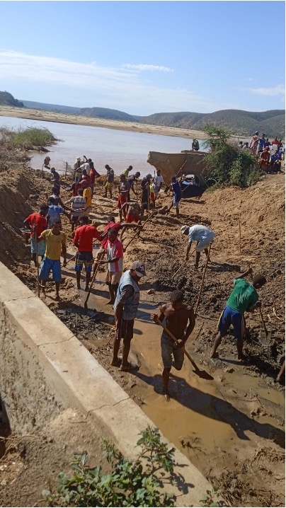 Achat de 2 sacs de riz pour les cultivateurs qui vont remettre en état le barrage du canal de Fiherena. Puis, achat de 250 sacs vides afin de les remplir de sable pour effectuer un barrage et pouvoir creuser le sol après le passage du cyclone. Ce travail va permettre aux cultivateurs d’ irriguer à nouveau les champs.